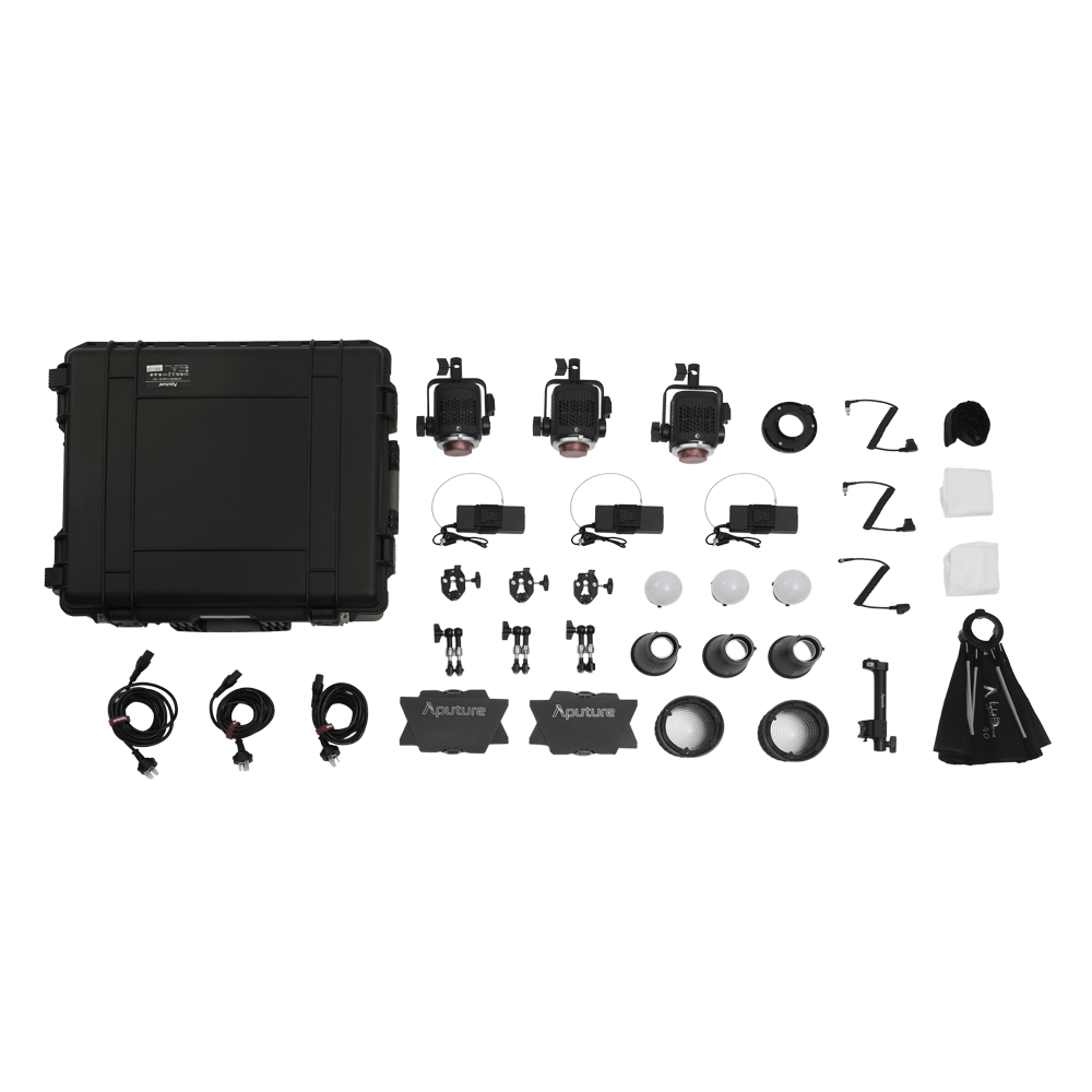 Le kit 3 projecteurs Aputure STORM 80c est une solution d’éclairage professionnelle tout-en-un. Il comprend trois lampes STORM 80c équipées du moteur lumineux BLAIR-CG, des Hyper Reflectors, des Fresnels CF4 avec volets, des diffuseurs Mini Lantern, le diffuseur Light Dome 40, un adaptateur Bowens, une poignée handheld, des câbles pour batteries, ainsi que des pinces de fixation — le tout rangé dans une valise rigide à roulettes.